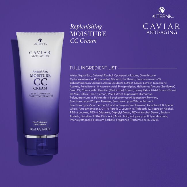 Water/Aqua/Eau, Cetearyl Alcohol, Cyclopentasiloxane, Dimethicone, Cyclohexasiloxane, Propanediol, Glycerin, Panthenol, Polyquaternium-55, Behentrimonium Chloride, Alaria Esculenta Extract, Caviar Extract, Tocopheryl Acetate, Polysilicone-15, Ascorbic Acid, Phospholipids, Helianthus Annuus (Sunfower) Seed Oil, Chamomilla Recutita (Matricaria) Extract, Honey Extract/Mel Extract/Extrait de Miel, Citrus Limon (Lemon) Peel Extract, Superoxide Dismutase, Polyquaternium-11, Polyimide-1, Saccharomyces/Magnesium Ferment, Saccharomyces/Copper Ferment, Saccharomyces/Silicon Ferment, Saccharomyces/Zinc Ferment, Saccharomyces/Iron Ferment, Tocopherol, Butylene Glycol, Amodimethicone, C11-15 Pareth-7, Laureth-9, Trideceth-12, Isopropyl Alcohol, PEG-4 Laurate, PEG-4 Dilaurate, Caprylyl Glycol, PEG-4, Alcohol Denat., Sodium Acetate, Disodium EDTA, Citric Acid, Acetic Acid, Iodopropynyl Butylcarbamate, Phenoxyethanol, Potassium Sorbate, Fragrance (Parfum).