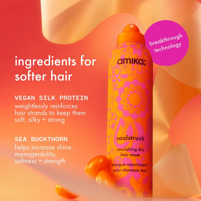 Soulstruck Nourishing Dry Hair Mask is your shortcut to soft, moisturized hair in seconds. This mess-free, leave-in spray mask softens and reinforces hair fibers with strengthening vegan silk protein and sea buckthorn—delivering results that are as soft as they are strong. Its weightless, aerosol formula gives hair a stroke of nourishment, softness, and strength without a wash and without any buildup.