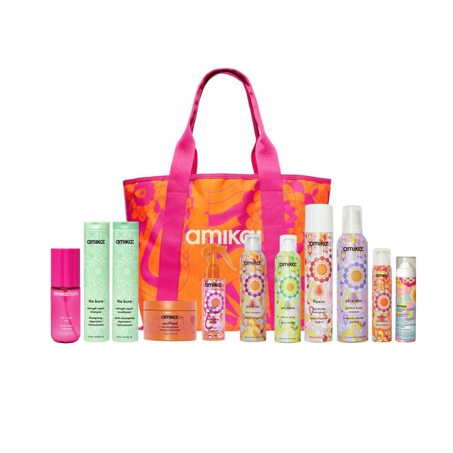 Introducing the must-have kit for summer - the Limited Edition amika Try Me Kit. This comprehensive 9-piece kit includes 8 full-size amika best-selling products. Each item has been carefully selected to elevate your haircare routine. Discover The Kure Bond Repair Shampoo, The Kure Bond Repair Conditioner, Soulfood Nourishing Mask, The Wizard Detangling Primer, Perk Up Dry Shampoo, Plus Size Perfect Body Mousse, Un.Done Texture Spray, and Fluxus Touchable Hairspray. As a bonus, the kit also includes a cute Signature Tote Bag. With a retail value of $256, this kit offers exceptional value and is perfect for those looking to indulge in premium haircare essentials.