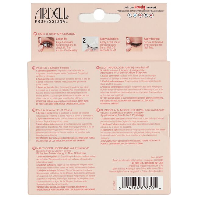 Bendy, Comfy Invisiband: The only lash technology that keeps you from needing to do a lot of covering up and fiddling with falsies. These lashes are designed with an invisible, flexible lash band that won't bunch up, leaving you with an elegant seamless transition from your lids to your lashes. Offers a secure hold that backs you up for long hours or even through happy tears.
