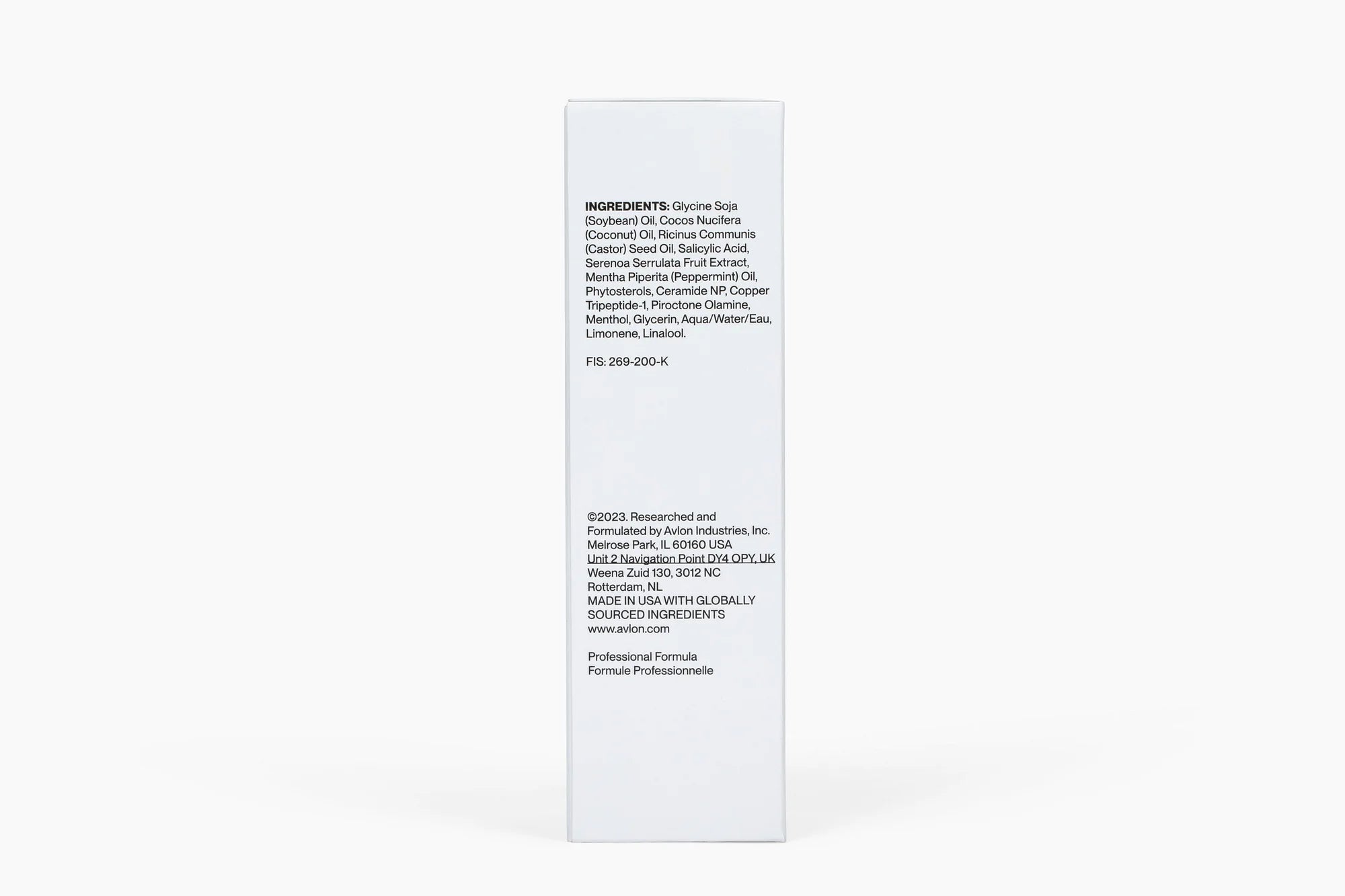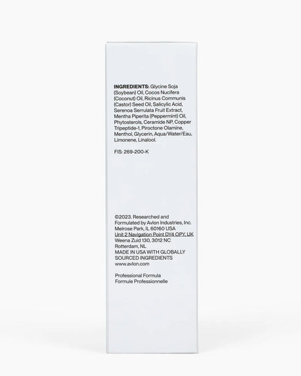 Glycine Soja (Soybean) Oil, Cocos Nucifera (Coconut) Oil, Ricinus Communis (Castor) Seed Oil, Salicylic Acid, Serenoa Serrulata Fruit Extract, Melaleuca Alternifolia (Tea Tree) Leaf Oil, Mentha Piperita (Peppermint) Oil, Phytosterols, Ceramide NP, Copper Tripeptide-1, Copper Tripeptide-34, Piroctone Olamine, Menthol, Glycerin, Aqua/Water/Eau, Limonene, Linalool.