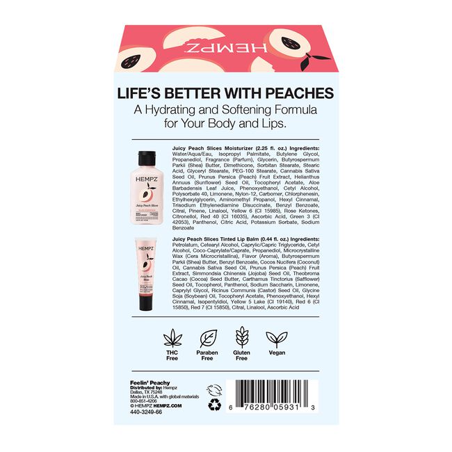 Moisturizer: Water/Aqua/Eau, Isopropyl Palmitate, Butylene Glycol, Propanediol, Fragrance (Parfum), Glycerin, Butyrospermum Parkii (Shea) Butter, Dimethicone, Sorbitan Stearate, Stearic Acid, Glyceryl Stearate, PEG-100 Stearate, Cannabis Sativa Seed Oil, Prunus Persica (Peach) Fruit Extract, Helianthus Annuus (Sunflower) Seed Oil, Tocopheryl Acetate, Aloe Barbadensis Leaf Juice, Phenoxyethanol, Cetyl Alcohol, Polysorbate 40, Limonene, Nylon-12, Carbomer, Chlorphenesin, Ethylhexylglycerin, Aminomethyl Propanol, Hexyl Cinnamal, Trisodium Ethylenediamine Disuccinate, Benzyl Benzoate, Citral, Pinene, Linalool, Yellow 6 (CI 15985), Rose Ketones, Citronellol, Red 40 (CI 16035), Ascorbic Acid, Green 3 (CI 42053), Panthenol, Citric Acid, Potassium Sorbate, Sodium Benzoate