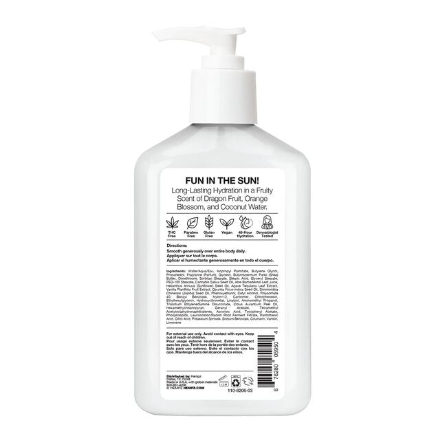 Water/Aqua/Eau, Isopropyl Palmitate, Butylene Glycol, Propanediol, Fragrance (Parfum), Glycerin, Butyrospermum Parkii (Shea) Butter, Dimethicone, Sorbitan Stearate, Stearic Acid, Glyceryl Stearate, PEG-100 Stearate, Cannabis Sativa Seed Oil, Aloe Barbadensis Leaf Juice, Helianthus Annuus (Sunflower) Seed Oil, Agave Tequilana Leaf Extract, Vanilla Planifolia Fruit Extract, Opuntia Ficus-Indica Seed Oil, Simmondsia Chinensis (Jojoba) Seed Oil, Phenoxyethanol, Cetyl Alcohol, Polysorbate 40, Benzyl Benzoate, Nylon-12, Carbomer, Chlorphenesin, Ethylhexylglycerin, Hydroxycitronellal, Linalool, Aminomethyl Propanol, Trisodium Ethylenediamine Disuccinate, Citrus Aurantium Peel Oil, Hexamethylindanopyran, Geranyl Acetate, Tetramethyl Acetyloctahydronaphthalenes, Ascorbic Acid, Tocopheryl Acetate, Phospholipids, Leuconostoc/Radish Root Ferment Filtrate, Pantothenic Acid, Citric Acid, Potassium Sorbate, Sodium Benzoate, Coumarin, Vanillin, Limonene