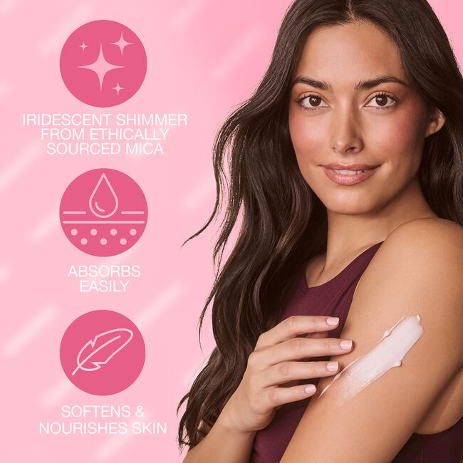- Helps moisturize while giving skin a shimmering glow from ethically sourced mica in a long-lasting scent