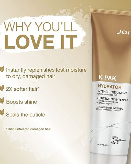 Quench thirsty hair with K-PAK Professional Hydrator Intense Treatment For Dry, Damaged Hair ? a powerful well of moisture that transforms dry, overprocessed strands into hair that feels soft, smooth, and oh-so-touchable.