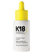 - Apply 1-3 drops of K18 molecular repair hair oil to damp hair, starting at the ends and working upward through the mid-lengths.