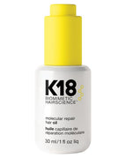 - Apply an additional 1-3 drops of K18 molecular repair hair oil to dry hair as a finisher.