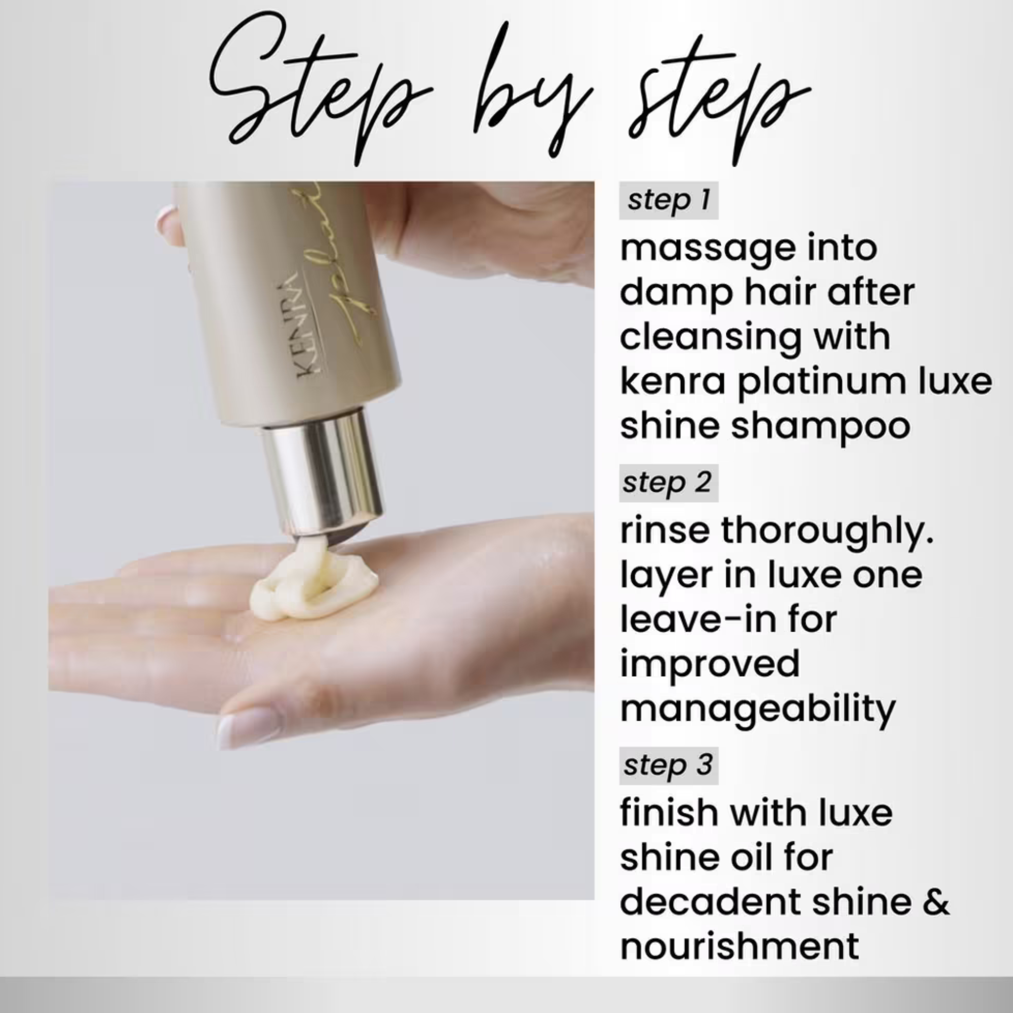 Massage into damp hair after cleansing with Kenra Platinum Luxe Shine Shampoo. Rinse thoroughly. Finish with Luxe One Leave-In.