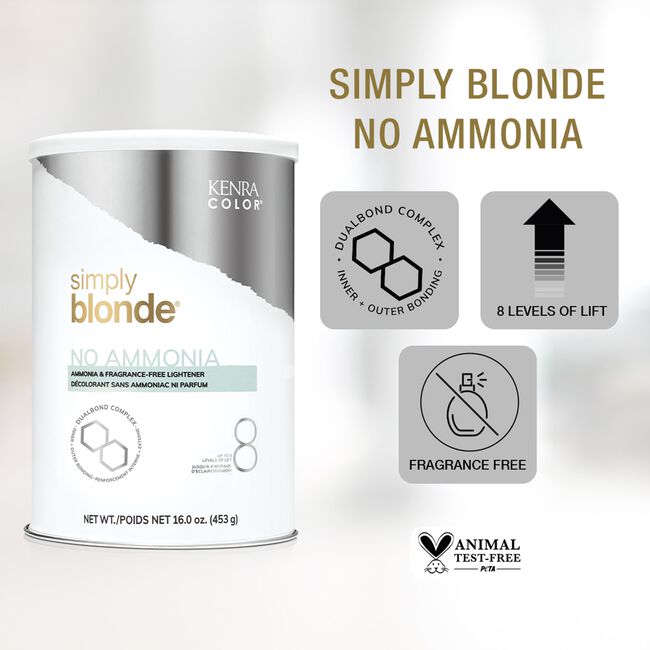Kenra Color Simply Blonde No Ammonia Lightener is an ammonia & fragrance-free lightener. Formulated with DualBond Complex to help protect the hair during lightening services by enforcing strong bonds. Blonding you can trust!