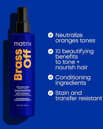 Your All-In-One Just Got Cooler. Brass Off All-In-One Toning Leave-In Spray is a buildable color depositing formula to neutralize unwanted brass, orange undertones in between salon visits and prepare hair for styling. For additional toning use in combination with Brass Off Shampoo and/or So Silver Custom Neutralization Mask.