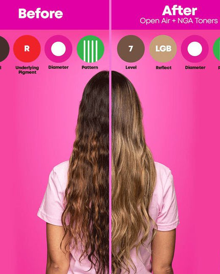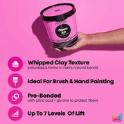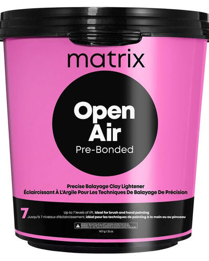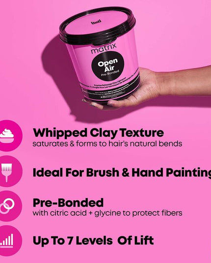 Precise Balayage Clay Lightener for every Hair Pattern. Pre-bonded with citric acid & glycine to protect fibers and includes Kaolin Clay to hold moisture in the formula to protect the product from drying during application. Open Air Pre-Bonded's whipped clay texture saturates & forms to hair’s natural bends and provides up to 7 levels of lift.