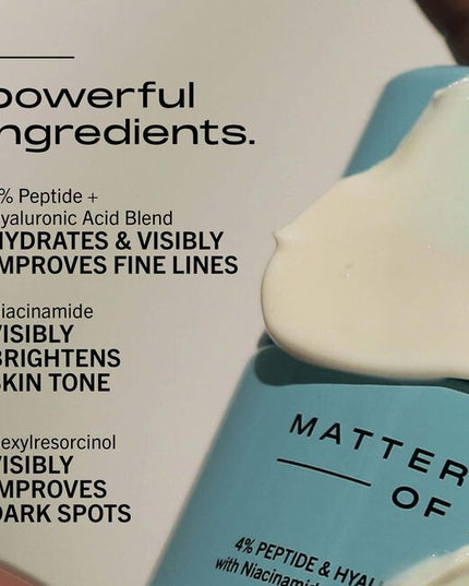 4% PEPTIDE & HYALURONIC ACID BLEND: Combines four molecular weights of hyaluronic acid for deep hydration and two well-studied peptides known to plump skin and improve the appearance of fine lines.