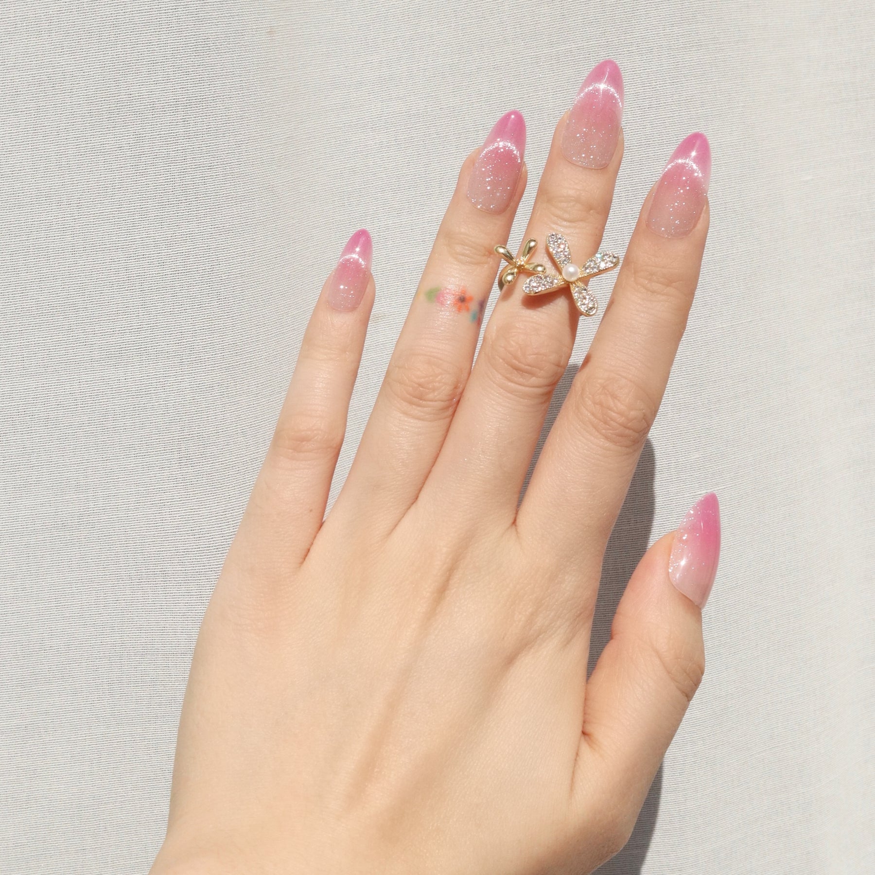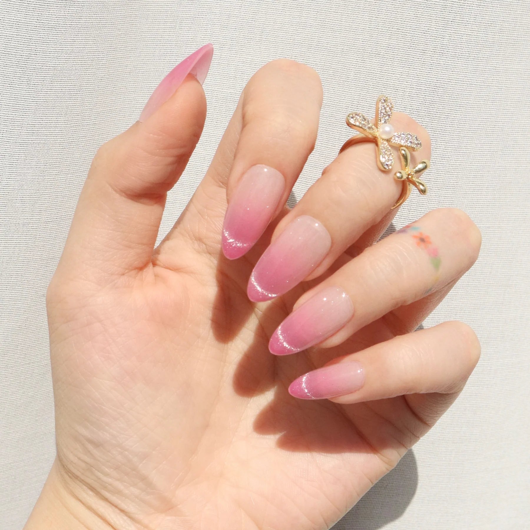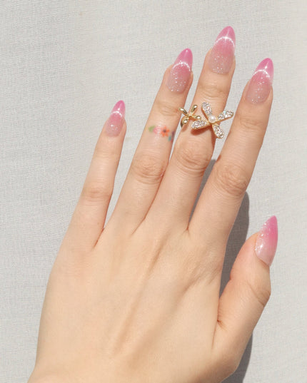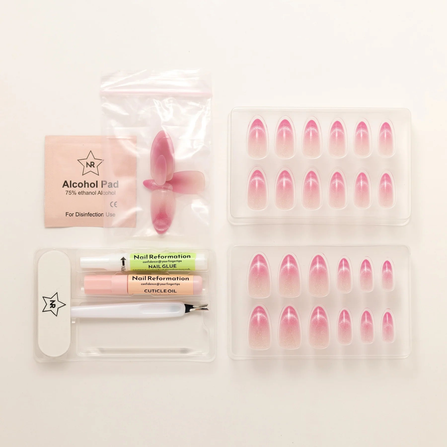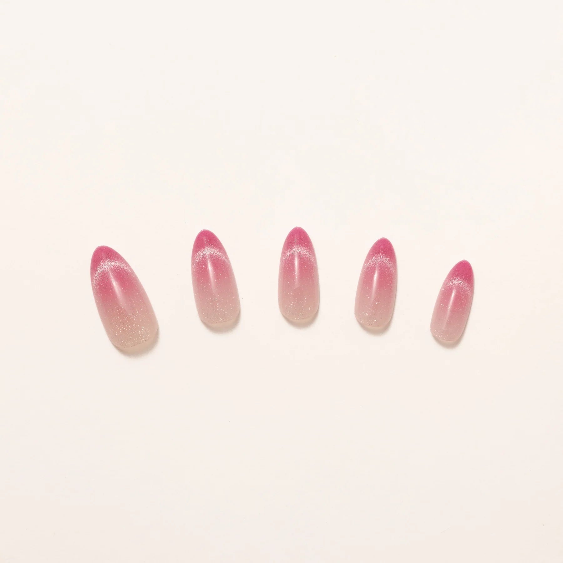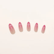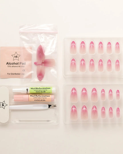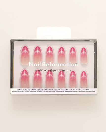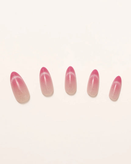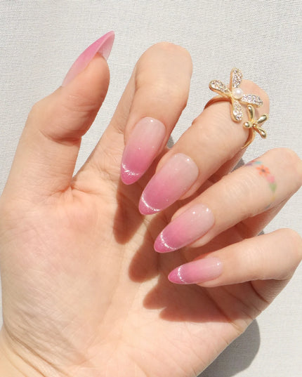 A soft blush with a dewy glow. Rosewater press-ons blend delicate pink hues into a dreamy ombré effect, mimicking the elegance of rose-infused water. The subtle shimmer adds a light-catching finish, giving the design a fresh, radiant glow. With a flattering medium almond shape, this set brings just the right balance of softness and sophistication. Whether you're going for romantic elegance or an everyday polished look, Rosewater is a fresh take on effortless beauty.