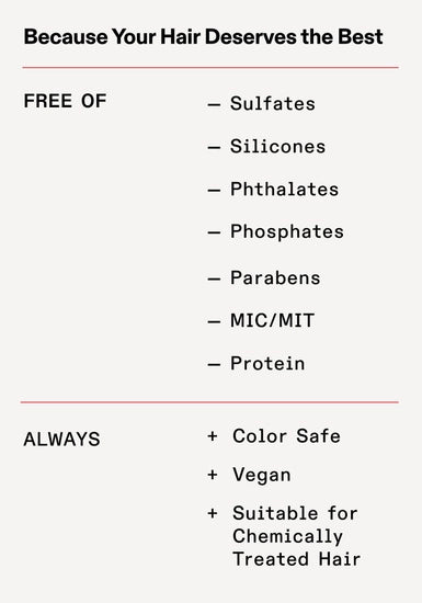 Free Of: Sulfates, Silicones, Phthalates, Phosphates, Paraben, MIC/MIT, Protein. Color safe, vegan, suitable for chemically treated hair