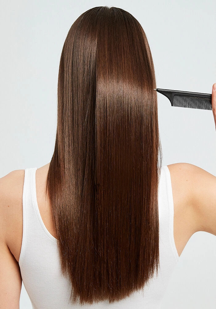- Smooth into hair from eyeline down focusing on mid-lengths and ends.