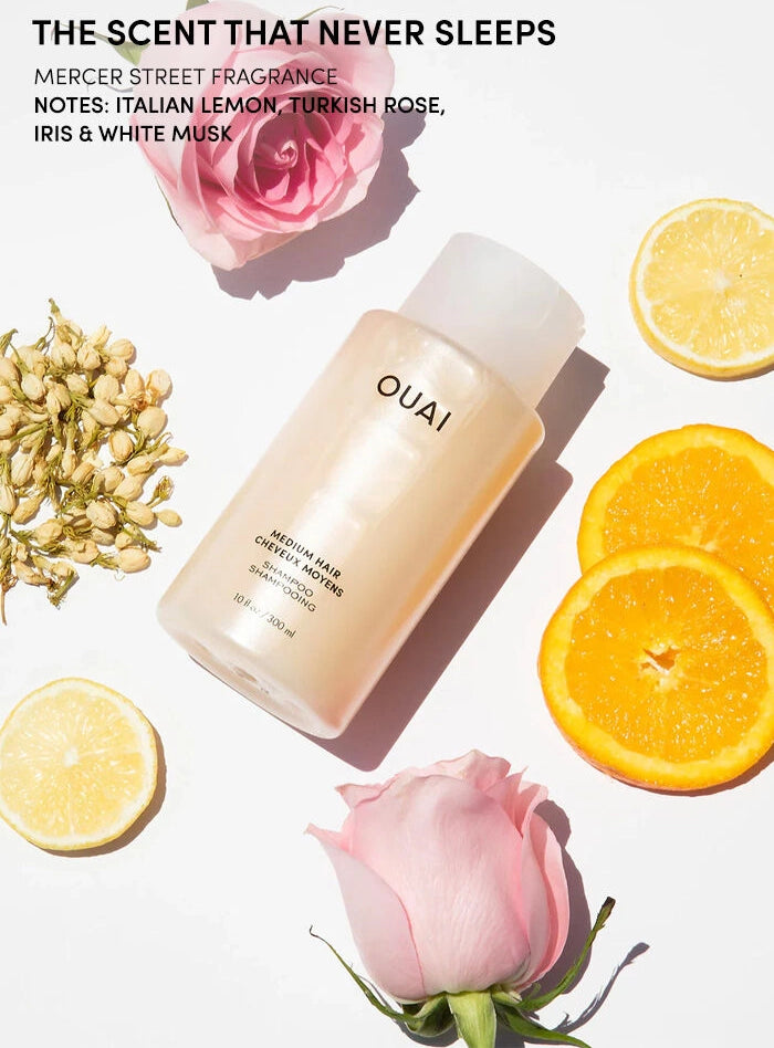 This Medium Hair Shampoo cleanses while strengthening, reviving shine & eliminating frizz for medium strands. Wash your OUAI to a happy medium & leave hair feeling repaired & nourished while smelling amazing thanks to Mercer Street—a luxe fragrance with notes of Italian lemon, jasmine, & white musk.