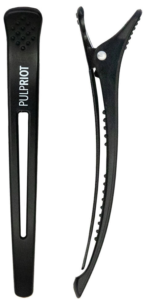 Professional sectioning clip designed to be tight fitting with a silicone strip on the inside to help hold hair while resisting markings.