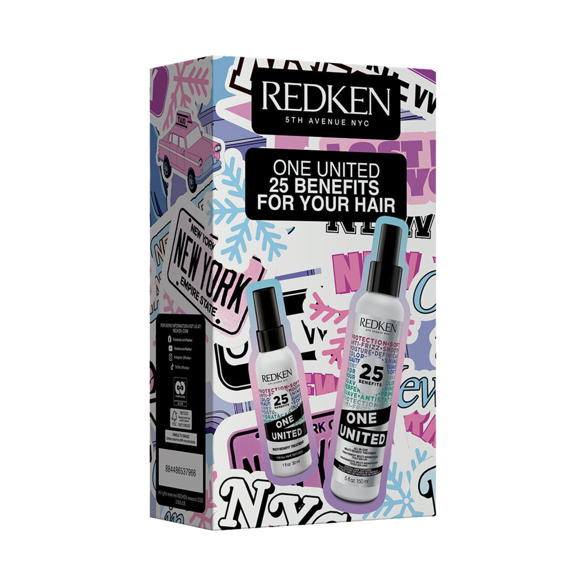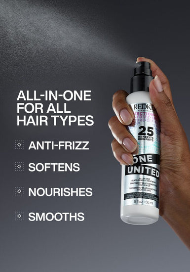 Redken's One United multi-benefit treatment is an all-in-one leave-in with 25 benefits in every spray. One United offers 450° heat protection while conditioning, nourishing, and helping detangle all hair types and textures.