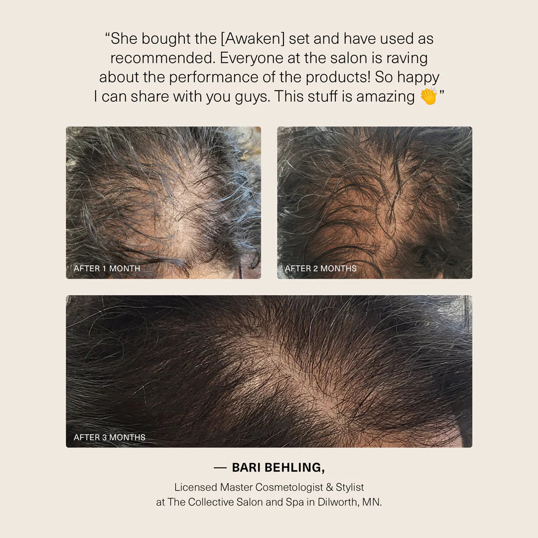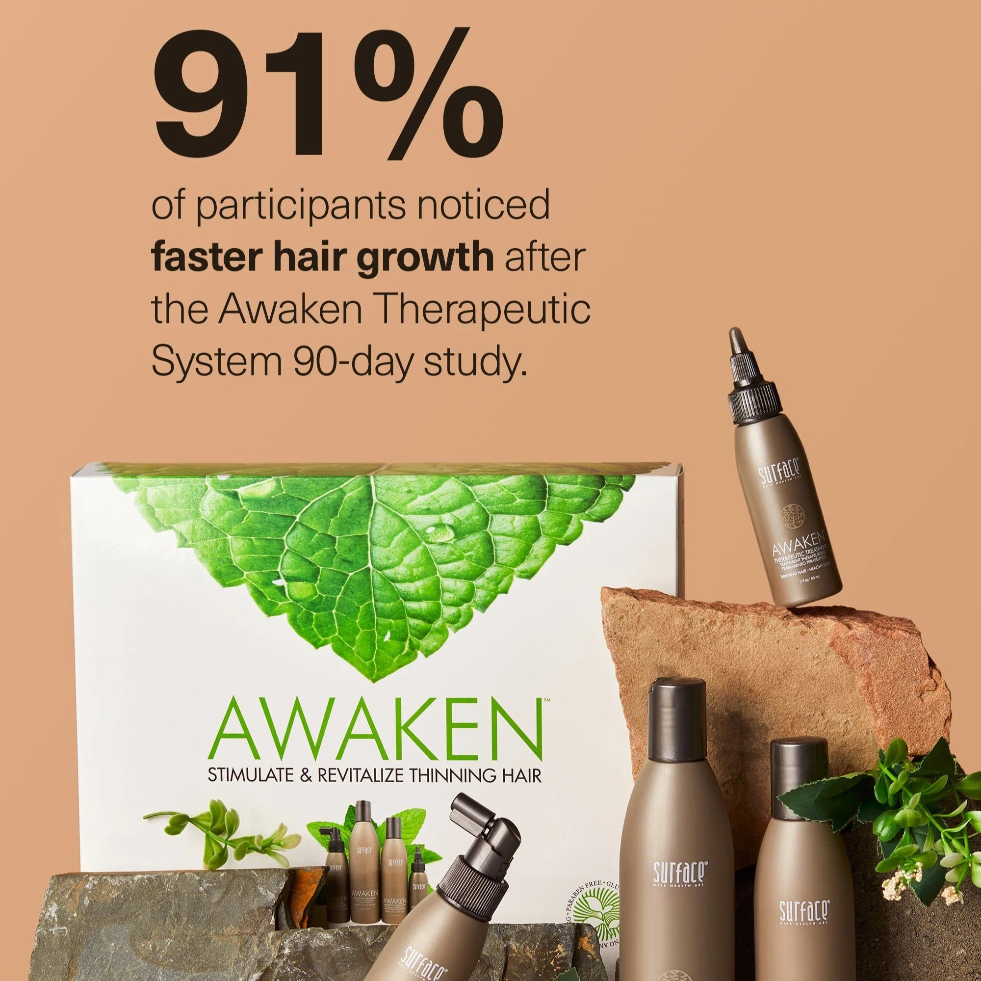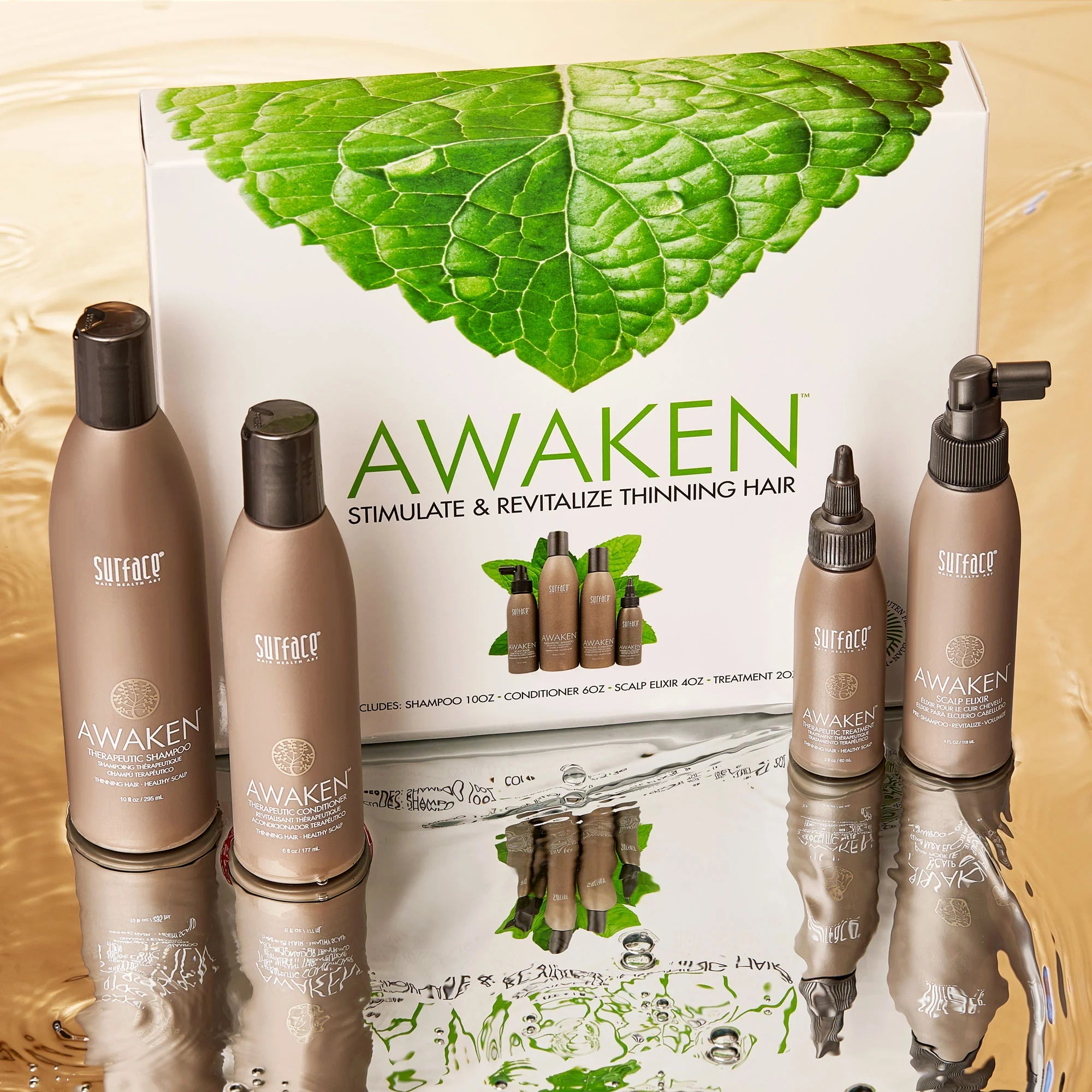 Awaken Therapeutic Shampoo Capsicum Frutescens (Cayenne) Extract, Menthol, Orbignya Oleifera (Babassu) Oil, Linum Usitatissimum (Flax) Seed Oil, Hydrolyzed Amaranth Protein, Hydrolyzed Soy Protein, Hydrolyzed Vegetable Protein, Cocos Nucifera (Coconut) Oil, Tocopheryl Acetate (Vitamin E), Retinyl Palmitate (Vitamin A), Ascorbic Acid (Vitamin C), Glycol Stearate, Polysorbate 20, Stearamine Oxide, DI-PPG-2 Myreth-10 Adipate, Cinnamidopropyltrimonium Chloride, Polyquaternium-7, Magnesium Carbonate, Acetamidopropyl Trimonium Chloride, Citric Acid, Cocamidopropyl Betaine, Sodium Methyl-2 Sulfolaurate, Disodium 2-Sulfolaurate, Sodium Lauryl Sulfoacetate, Decyl Glucoside, Glycol Distearate, Laureth-4,Polyquaternium-10, Disodium EDTA, Panthenol, Phenoxyethanol, Caprylyl Glycol, Sorbic Acid, Ceramide NP, Tourmaline Powder, Water (Aqua) Awaken Therapeutic Conditioner Serenoa Serrulata Fruit Extract, Camellia Sinensis Leaf Extract, Equisetum Arvense Extract, Mentha Piperita, (Peppermint) Leaf Extract, Juglans Nigra (Black Walnut) Extract, Taraxacum Officinale (Dandelion) Extract, Menthol, Capsicum Frutescens (Cayenne) Extract, Orbignya Oleifera (Babassu) Oil, Linum Usitatissimum (Flax) Seed Oil, Hydrolyzed Amaranth Protein, Hydrolyzed Soy Protein, Hydrolyzed Vegetable Protein, Tocopheryl Acetate (Vitamin E) , Retinyl Palmitate (Vitamin A), Ascorbic Acid (VitaminC), Cocos Nucifera Oil, Dimethicone, Glycoproteins, Panthenol, Sorbitol, Glycine, Alanine, Proline, Serine, Threonine, Arginine, Lysine, Glutamic Acid, Saccharomyces/Silicon Ferment, Saccharomyces/Magnesium Ferment, Saccharomyces/Copper Ferment, Saccharomyces/Zinc Ferment, Saccharomyces/Iron Ferment, Linoleamidopropyl PG-Dimonium Chloride Phosphate, Ethoxydiglycol, Sodium PCA, Betaine, Phenoxyethanol, Cetrimonium Chloride, Cetyl Alcohol, Dicetyldimonium Chloride, Cetearyl Alcohol, Aminomethyl Propanol, Superoxide Dismutase, Ceramide NP, Tourmaline Powder, Caprylyl Glycol, Sorbic Acid, Water (Aqua) Awaken Therapeutic Treatment Sereona Serrulata (Saw Palmetto) Extract, Panax Ginseng Extract, Silybum Maranium Extract, Urtica Dioica (Nettle) Extract, Camellia Oleifera Leaf Extract, Ginkgo Biloba Leaf Extract, Humulus Lupulus (Hops) Extract, Melissa Officinalis (Balm Mint) Leaf Extract, Capsicum Frutescens (Cayenne) Extract, Orbignya Oleifera (Babassu) Oil, Menthol, Carrot Oleoresin, Cocos Nucifera (Coconut) Oil, Linum Usitatissimum (Flax) Seed Oil, Hydrolyzed Amaranth Protein, Aloe Barbadensis Leaf Juice, Glycine, Alanine, Proline, Serine, Threonine, Arginine, Lysine, Hydroxypropyltrimonium Hydrolyzed Soy Protein, Ceramide NP, Tourmaline Powder, Hydrolyzed Vegetable Protein, Tocopheryl Acetate (Vitamin E), Retinyl Palmitate (Vitamin A), Ascorbic acid (Vitamin C), Sorbic Acid, Panthenol, Sodium PCA, Betaine, Sorbitol, Glutamic Acid, Acetamide MEA, Hydrolyzed Soy Protein, Ethoxydiglycol, Methyl Nicotinate, Polysorbate 20, Polysorbate 60, Polysorbate 80, Aminomethyl Propanol, Phenoxyethanol, Cocamidopropyl Betaine, Fragrance (Parfum), Citric Acid, Glycerin, Caprylyl Glycol, Superoxide Dismutase, Saccharomyces/Silicon Ferment, Saccharomyces/Magnesium Ferment, Saccharomyces/Copper Ferment, Saccharomyces/Iron Ferment, Saccharomyces/Zinc Ferment, Hydroxypropyltrimonium Hydrolyzed Vegetable Protein, Water/Eau Awaken Elixir Biotin, Serenoa Serrulata Fruit Extract, Camellia Sinensis Leaf Extract, Orbignya Oleifera (Babassu) Seed Oil, Equisetum Hiemale Extract, Capsicum Frutescens Fruit Extract, Carthamus Tinctorius (Safflower) Seed Oil, Mentha Piperita (Peppermint) Leaf Extract, Juglans Nigra (Black Walnut) Leaf Extract, Taraxacum Officinale (Dandelion) Leaf Extract, Glycoproteins, Tocopheryl Acetate (Vitamin E), Linum Usitatissimum (Flax) Seed Oil, Retinyl Palmitate(Vitamin A), Ceramide NP, Tourmaline, Saccharomyces/Silicon Ferment, Saccharomyces/Magnesium Ferment, Saccharomyces/Copper Ferment, Saccharomyces/Iron Ferment, Saccharomyces/Zinc Ferment, Sorbic Acid, Citric Acid, Aloe Barbadensis Leaf Juice, Panthenol, Menthol, Tetrasodium Edta, Hydrolyzed Vegetable Protein, Hydrolyzed Soy Protein, Camphor, Mentha Piperita (Peppermint) Oil, Sodium Pca, Betaine, Glutamic Acid, Hydrolyzed Amaranth Protein, Xymenynic Acid, Ascorbic Acid (Vitamin C), Superoxide Dismutase, Glycerin, Polysorbate 20, Phenoxyethanol , Caprylyl, Glycol, Sorbitol, Glycine, Alanine, Proline, Serine, Threonine, Arginine, Lysine, Water (Eau)