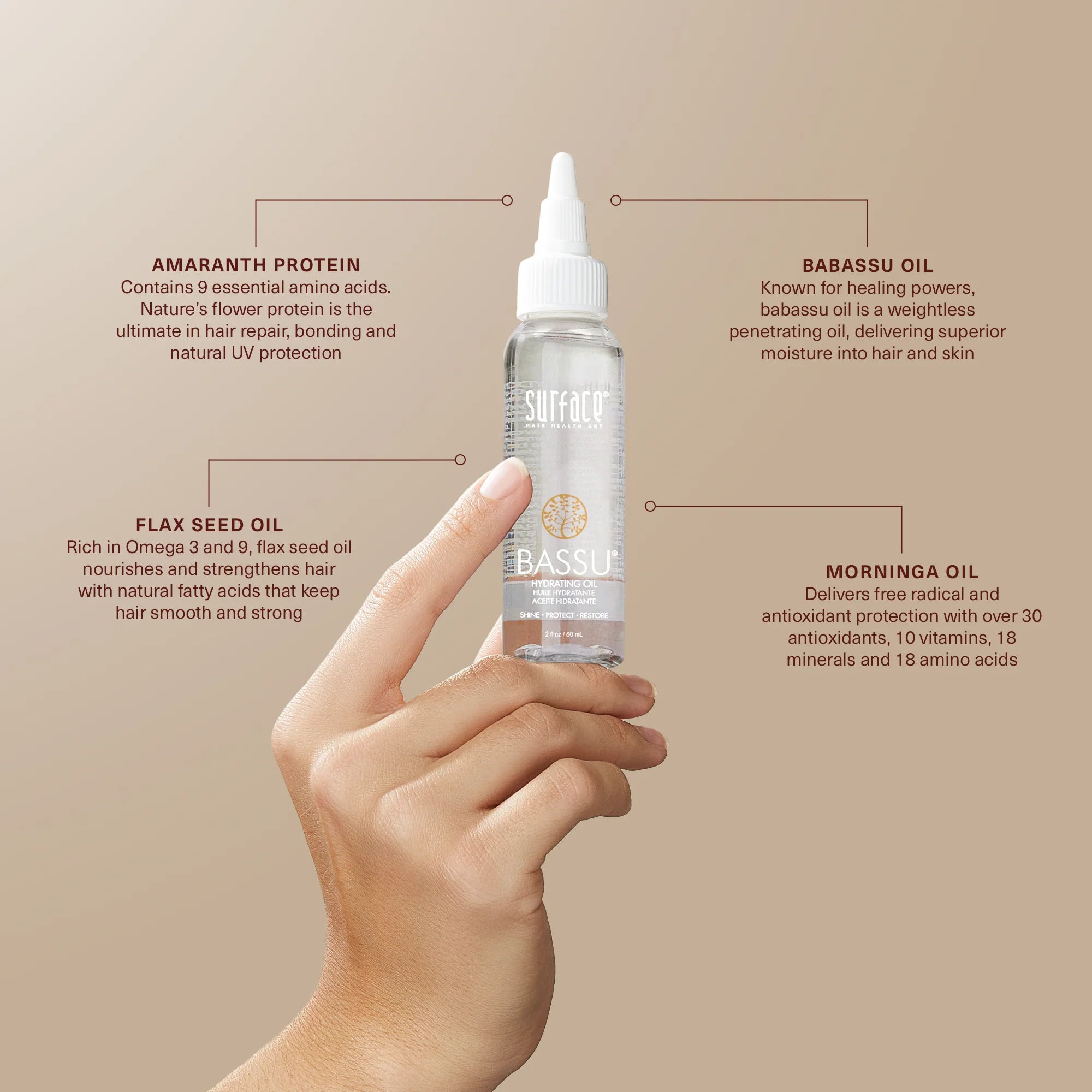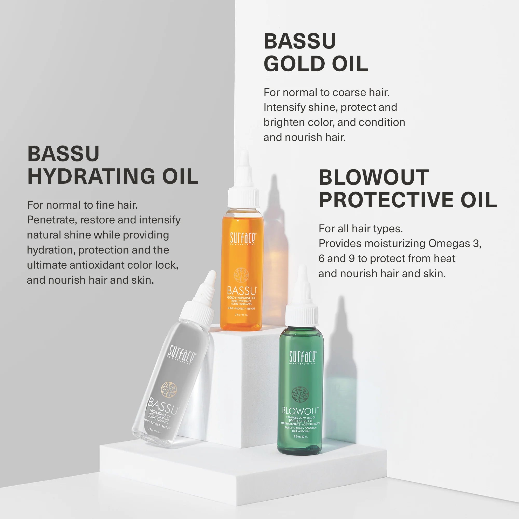 Hydrating oil for normal to fine hair. Surface's Bassu Hydrating Oil intensifies shine, color and condition. Babassu Oil and Color Vita Complex penetrate, restore and intensify natural shine while providing hydration, protection and the ultimate antioxidant color lock.