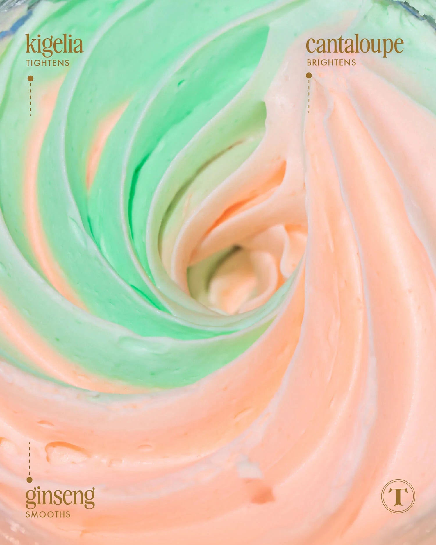 Shea Butter, Cocoa Butter, Coconut Oil, Jojoba Oil, Almond Oil, Phenoxyethanol, Tetrasodium Diacetate, Vitamin E, Kigelia African Fruit Extract, Panax Ginseng Root Extract, Cucumis (Melo) Melon Fruit Extract, Actinidia Chinensis Fruit Extract, Mica, Titanium Dioxide, Iron Oxide, Manganese Violet, Fragrance.
