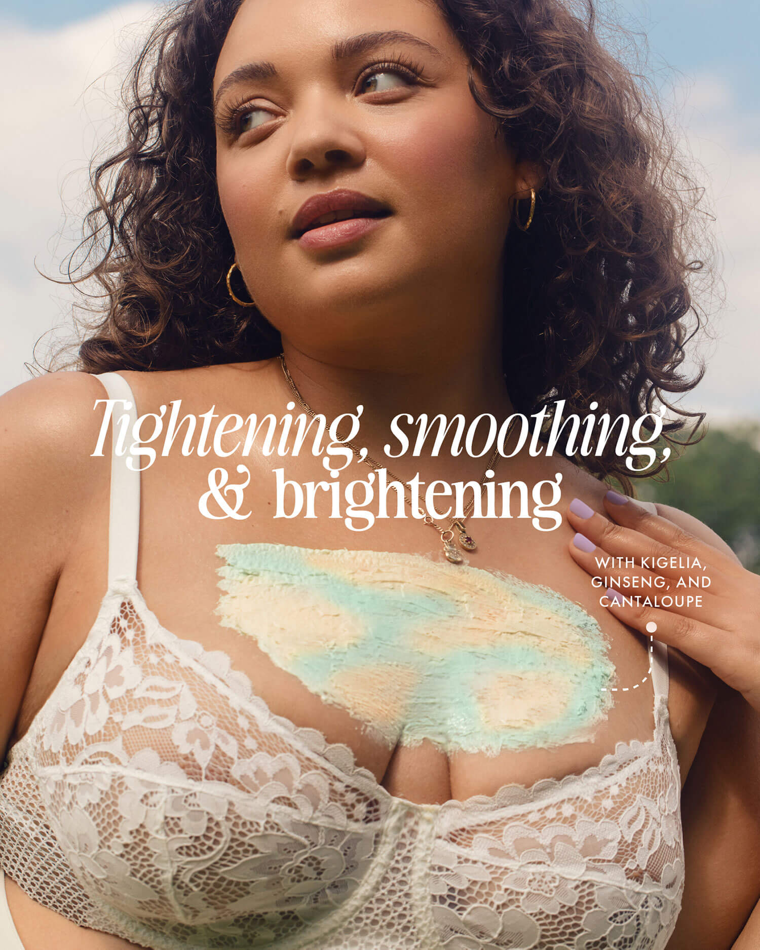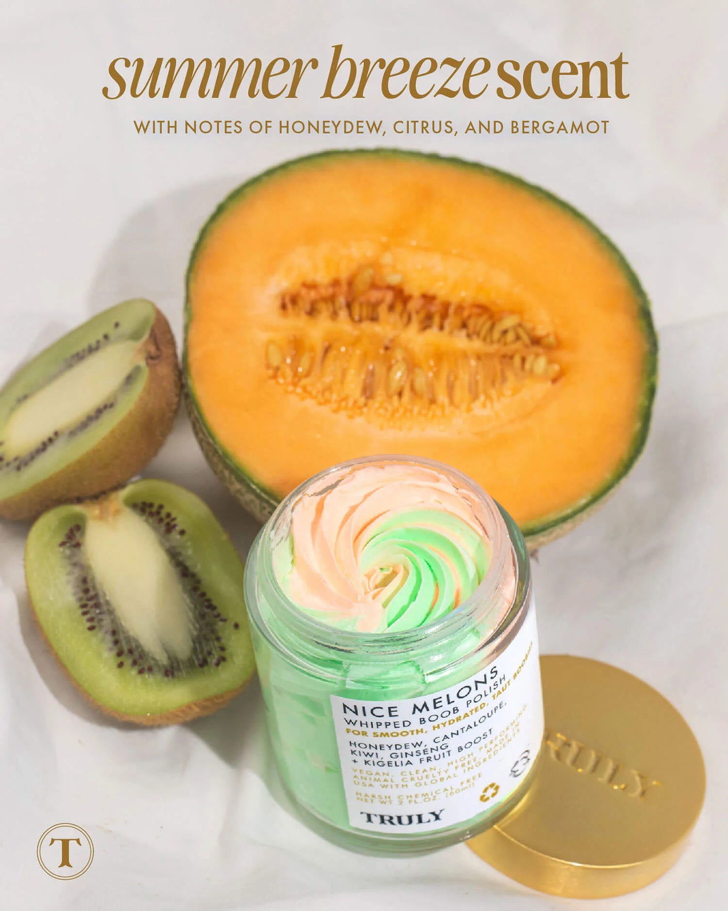 Truly's Nice Melons Boob Polish blend of melon, kiwi and ginseng to deeply condition, even hyperpigmentation, and visibly tighten the complexion of the chest and neck.