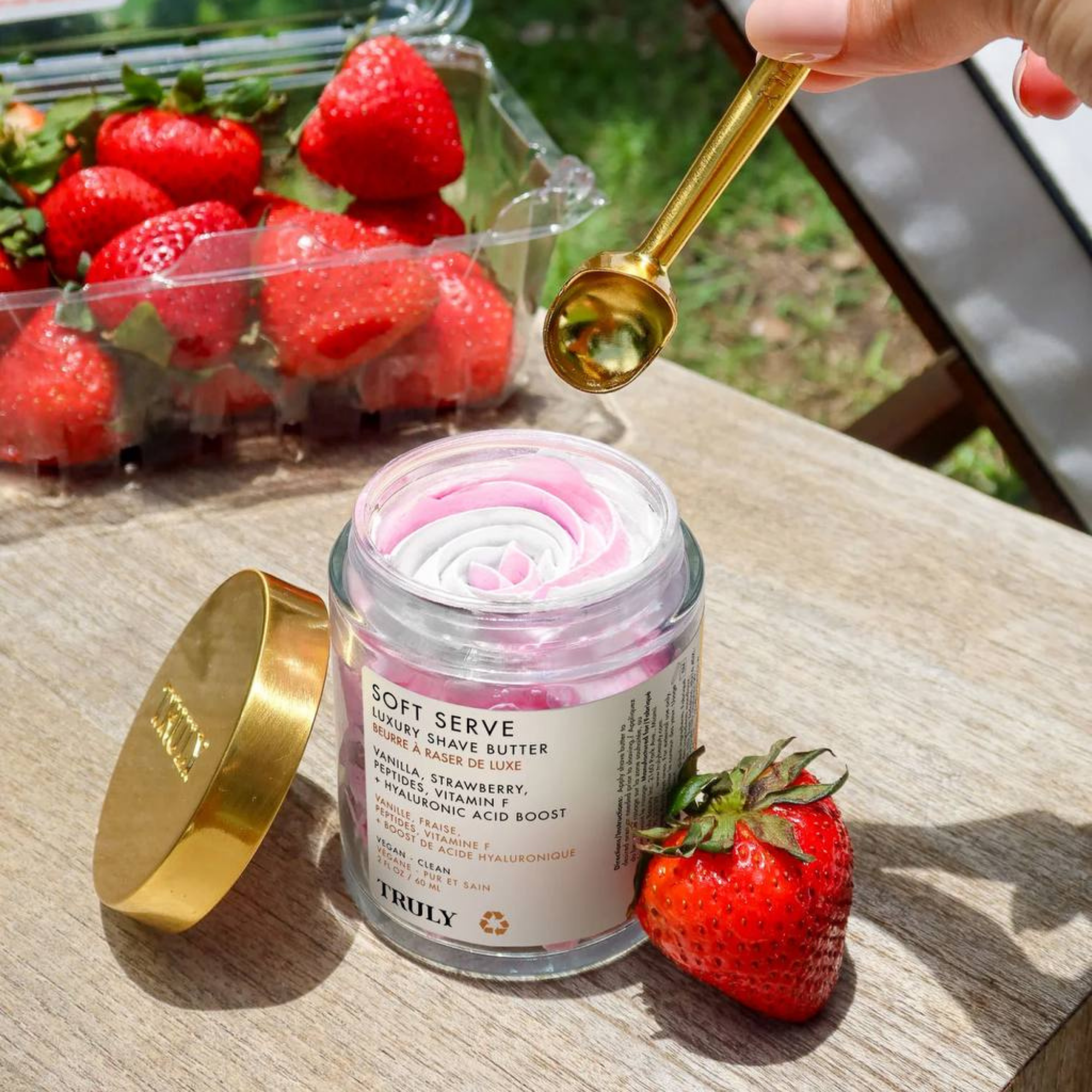 Get the scoop on upgrading your shave. Treat yourself to the yummy richness of our Soft Serve Luxury Shave Butter. Its dessert like swirl packs powerful peptides, while the thick texture softens hair and protects even the most sensitive skin from razor burn. And bonus..it smells like a delicious strawberry sundae!