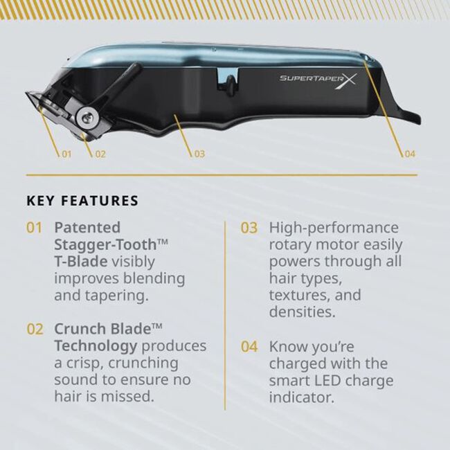The all-new Super Taper X™ features advanced blade technology and a powerful motor, all within a lightweight clipper that is ideal for off-scalp blending and shaping
